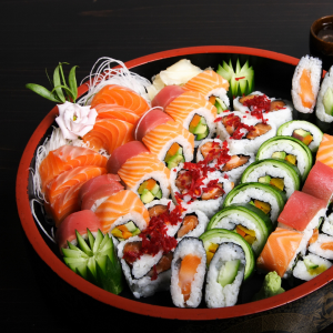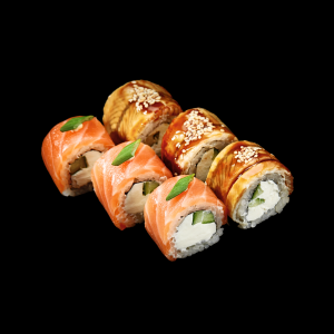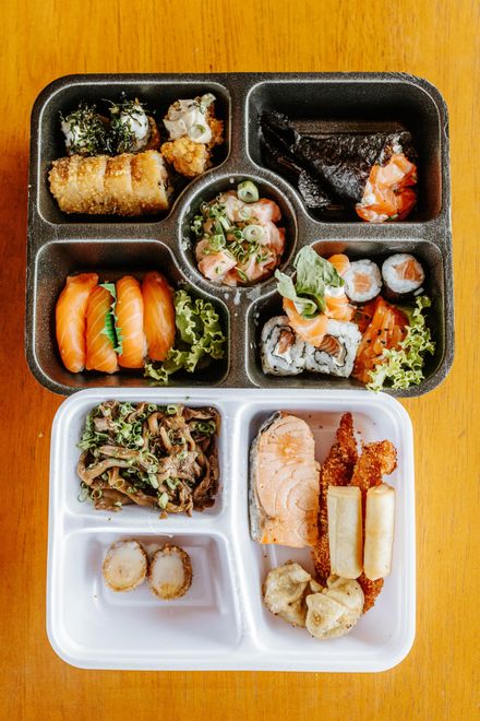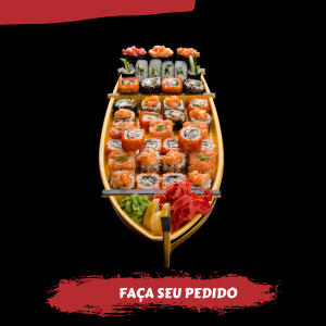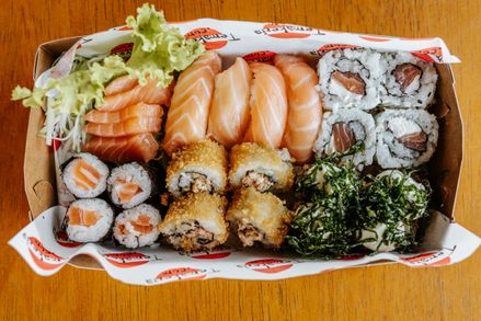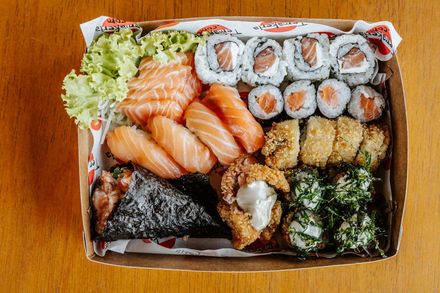 Combinado delicioso com 5 sashimis de salmão, 4 uramakis, 4 hot rolls, 4 mini hot couve e 4 niguiri de salmão